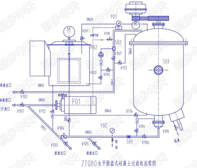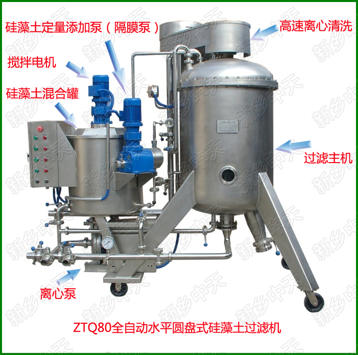 過(guò)濾時(shí),首先在過(guò)濾盤(pán)上形成硅藻土預(yù)涂層。被過(guò)濾的液體經(jīng)硅藻土預(yù)涂層時(shí),其中的雜質(zhì)即被阻擋;而純靜的液體經(jīng)過(guò)微觀(guān)管狀或片狀的間隙以及顆粒之間的間隙通過(guò)過(guò)濾層,從而起到過(guò)濾作用。隨過(guò)濾時(shí)間的推移,在預(yù)涂層上被濾掉的雜質(zhì)會(huì)越來(lái)越多,且將阻塞過(guò)濾通道。因此在過(guò)濾過(guò)程中,還需對(duì)進(jìn)入過(guò)濾罐的被過(guò)濾的液體,添加一定劑量相應(yīng)粒度的硅藻土,以維持正常的過(guò)濾過(guò)程。另外,如果過(guò)濾時(shí)需要脫色,還需加入一定比例的活性炭。
