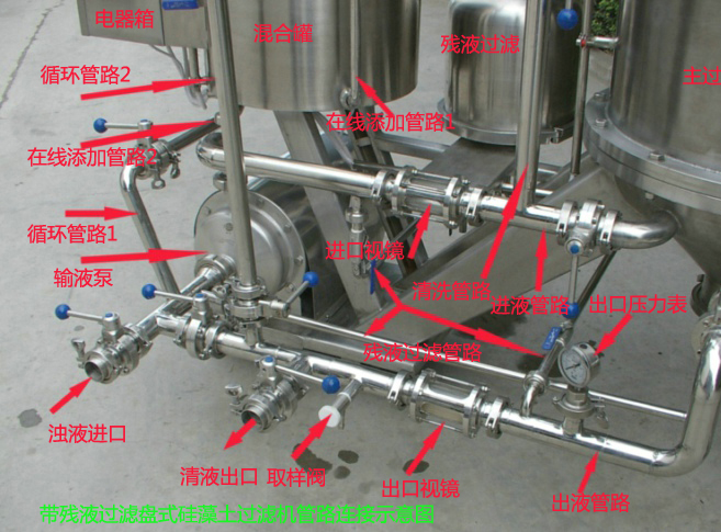 過濾時(shí),首先在過濾盤上形成硅藻土預(yù)涂層。被過濾的液體經(jīng)硅藻土預(yù)涂層時(shí),其中的雜質(zhì)即被阻擋;而純靜的液體經(jīng)過微觀管狀或片狀的間隙以及顆粒之間的間隙通過過濾層,從而起到過濾作用。隨過濾時(shí)間的推移,在預(yù)涂層上被濾掉的雜質(zhì)會(huì)越來越多,且將阻塞過濾通道。因此在過濾過程中,還需對(duì)進(jìn)入過濾罐的被過濾的液體,添加一定劑量相應(yīng)粒度的硅藻土,以維持正常的過濾過程。另外,如果過濾時(shí)需要脫色,還需加入一定比例的活性炭。